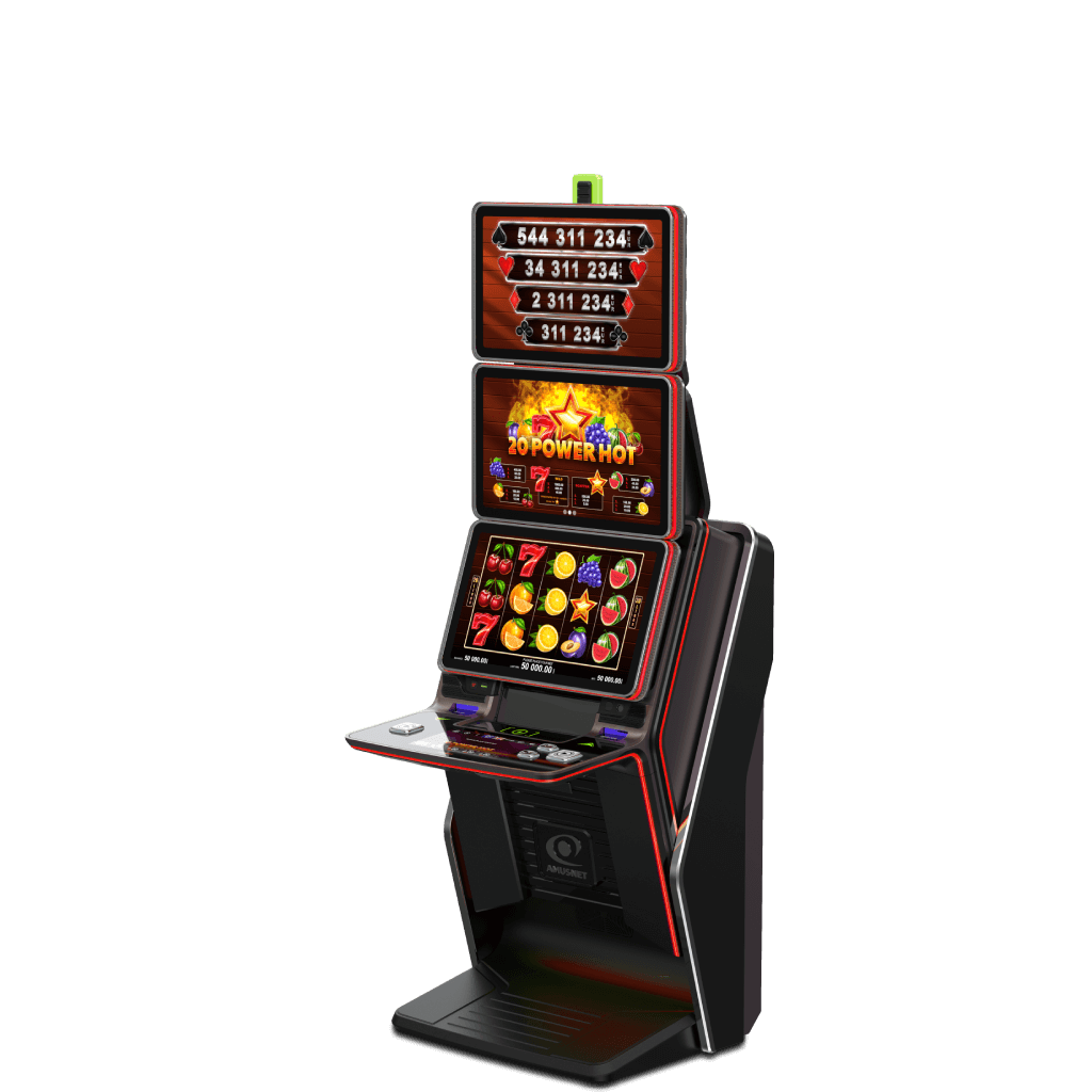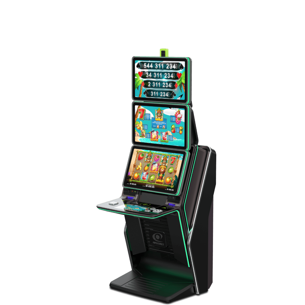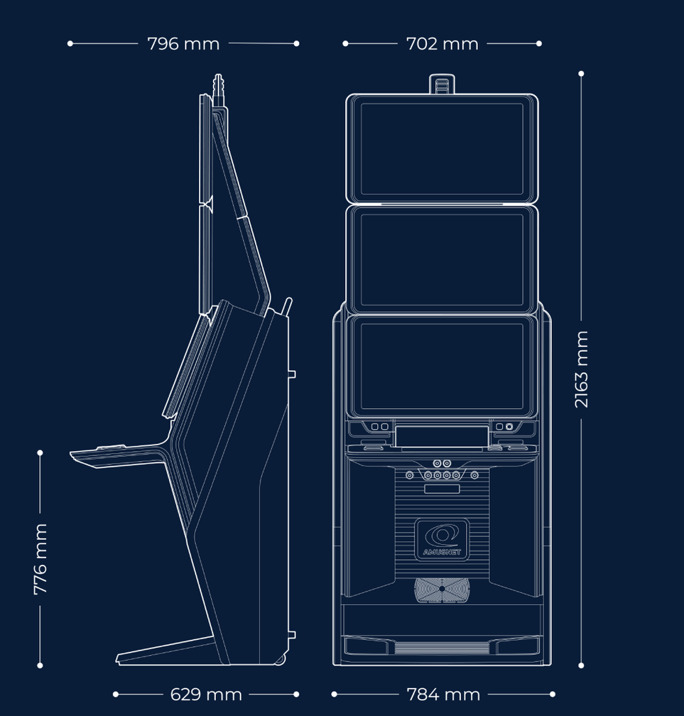 Example configuration: bank of six slot cabinets model Type S 27, equipped with accessories for improved players’ experience. High-resolution LED advert panels on both sides of the configuration. Straight LED connections between the cabinets and integrated glass tables. There is a possibility to add an optional double-sided LED board for jackpot visualisation on top.